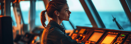 A determined and proud female captain diligently inspects advanced navigation systems in the control room, the open sea framed by large windows, banner