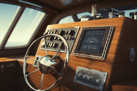 Nautical Control Panel, Private Yacht Steering Wheel and Modern Dashboard, Generative AI