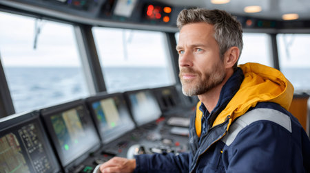 Serious ship captain navigating cargo, looking away from control panel on the bridge