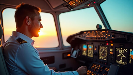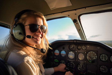 Focused female pilot flying commercial airplane in cockpit at sunset ensuring safe and professional air travel experience