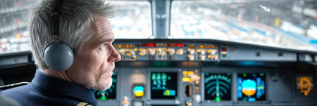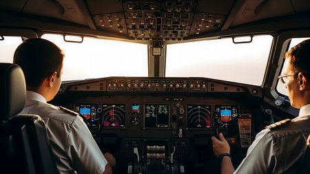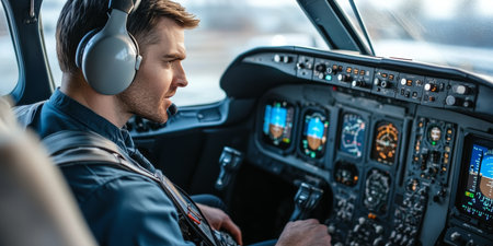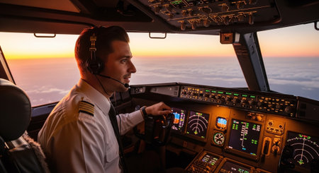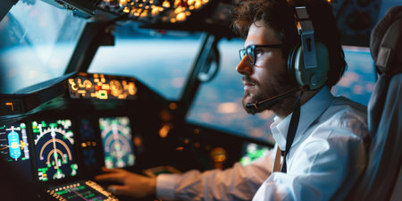 Pilot in Cockpit of Modern Airplane, Focused on Control Panel, Ensuring Safe Flight Operations