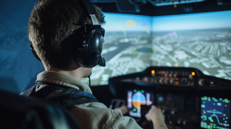 Smart pilot training and looking at control panel in simulated flight. Confident professional pilot practicing flying aircraft while sitting at plane cockpit and learning to use control panel. AIG42.