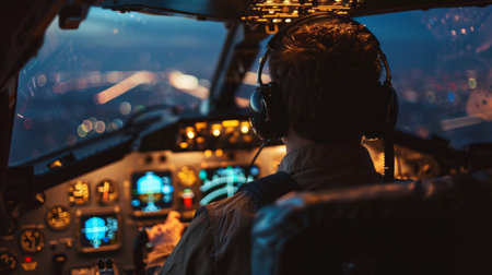 A veteran pilot in headphones intently monitors the cockpit instruments while flying above the city's lights.