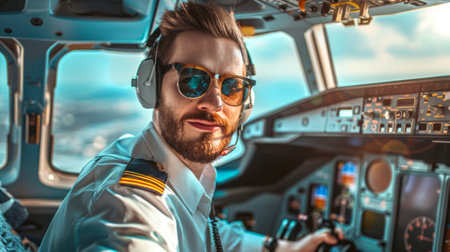 A pilot confidently sitting in the cockpit of a commercial plane, preparing for takeoff