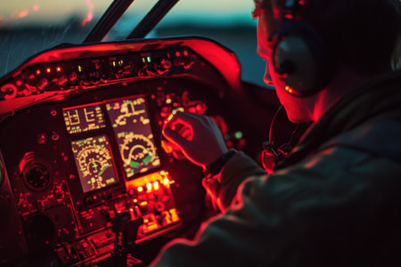 A pilot in the cockpit, operating an aircraft with illuminated control panels.
