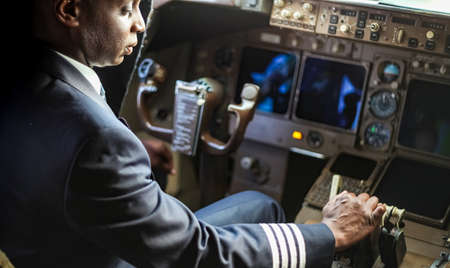 Caucasian man working on control panel of cabin of airliner stock photo. Airways concept