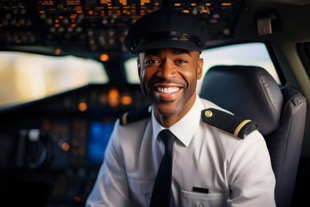 African American male pilot in an airplane cockpit. Concept of aviation, profession, pilot training, cockpit operations.