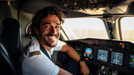 Portrait of a smiling male pilot in a cockpit of a passenger plane. AI generative