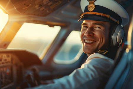 A realistic stock photo depicting a pilot sitting in the cockpit of a plane. The man is wearing a pilot uniform and is surrounded by various controls and instruments typical of an aircraft cockpit.