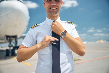 Beaming man in uniform sitting on the chair in cockpit of passenger airplane