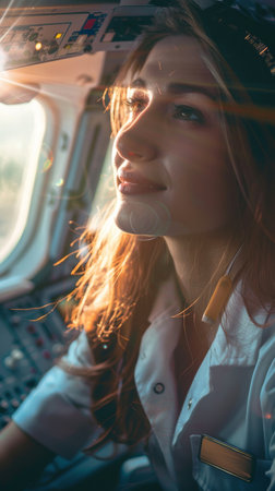 A woman is seated in the cockpit of an airplane, wearing a pilot uniform. She is focused and engaged in her work, surrounded by various control instruments and screens.