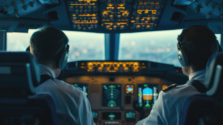Two pilots are in the cockpit of an airplane, looking out the window at the city below. The pilots are wearing headphones and are focused on their instruments. Scene is calm and professional