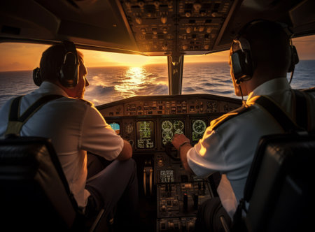 Two pilots looking at the camera in the cockpit of an airliner at sunset are a team of skilled professionals responsible for safely flying the aircraft during the evening hours. They must work together to navigate changing lighting and weather conditions, communicate effectively, and make critical decisions to ensure a smooth and secure flight for passengers. Generative AI
