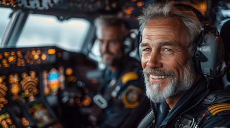 A Two pilots smiling in cockpit, showcasing teamwork and professionalism