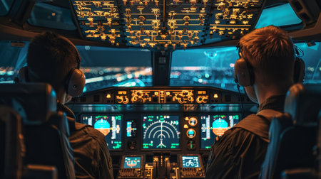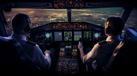 Two pilots focus on their instruments as they approach landing at a major airport. The cockpit displays are lit up, providing crucial flight data in the dark.