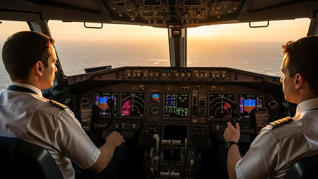 Two white male pilots in an airplane cockpit during a sunset flight. Concept of aviation, teamwork, piloting, flight safety.