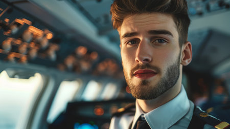 A man is seated in the cockpit of an airplane, wearing a pilots uniform. He is focused on the controls, with various dials and instruments visible in the background.