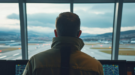 Close-up of air traffic controller, focus on radar screens tracking aircraft, active runway and airport visible through large windows