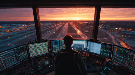 Control Tower Operator Overseeing Runway at Sunset with Multiple Screens Displaying Aviation Data and Traffic Near Airport
