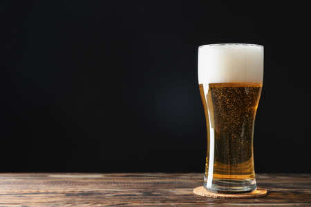 foam beer poured into a glass on a black background with copy space