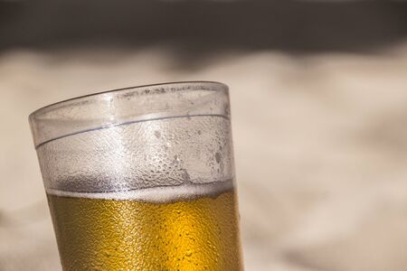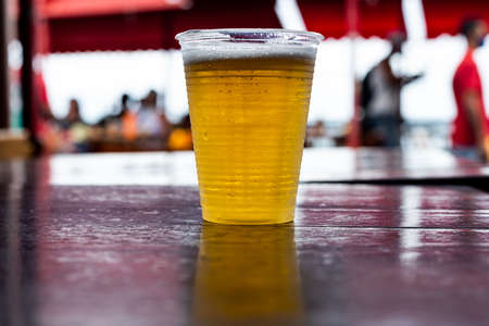 Plastic cup with beer inside to be drunk. Sao Joaquim Fair, Salvador, Bahia, Brazil.