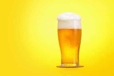 Glass of beer on a yellow background. White foam cap.