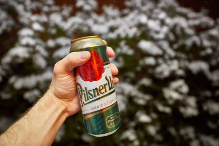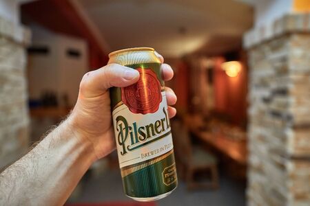 POZNAN, POL - APR 13, 2021: Pilsner Urquell beer put up for sale in a supermarket