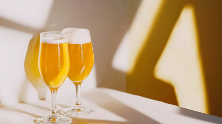 Two glasses of beer in soft sunlight casting shadows on a minimalistic background. Copy space.