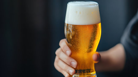 A refreshing glass of golden beer with a frothy foam topping held in a hand, perfect for celebrating special moments and enjoying leisure time.