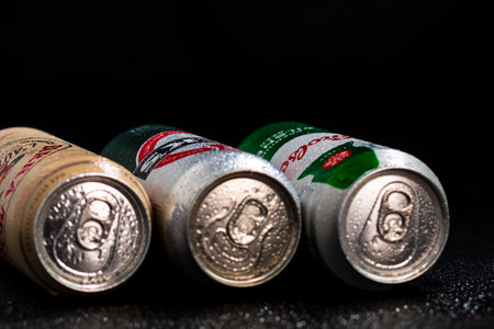 Condensation water droplets on beer cans isolated on black. Bucharest, Romania, 2020