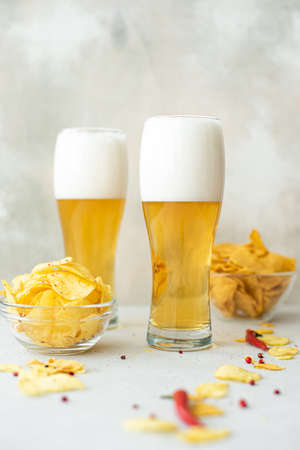 lager beer with spicy potato chips in tall glasses on a white table