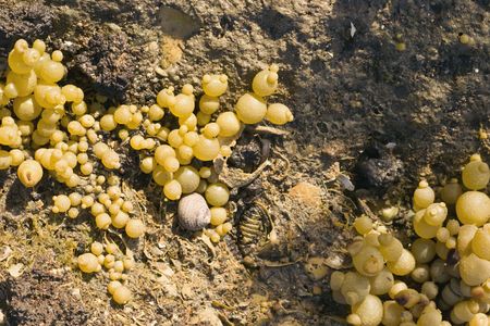 A mass of barnacles attached to a boulder at low tide on the coast of Maine.