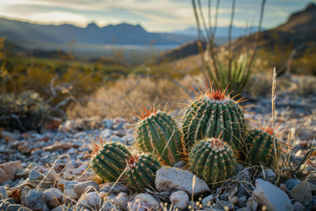 Close-up of different cacti against a desert background. Sweltering heat. Desert landscape. Generative AI.