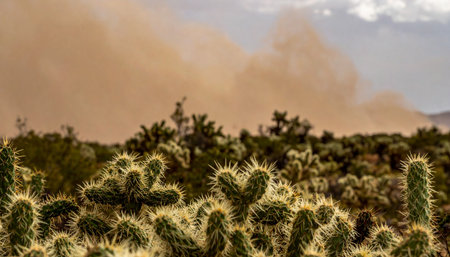 A massive wall of dust, a powerful haboob, advances across the arid landscape, threatening to engulf the resilient cholla cacti that stand firm in the foreground.
