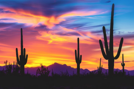 As the sun sets in the Sonoran Desert, vibrant hues of orange and blue fill the sky, casting silhouettes of cacti against the backdrop of distant mountains.