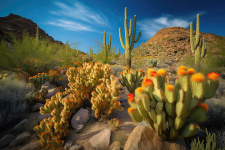 Living desert: Tall, colorful cacti in contrast, under deep blue skies., generative AI