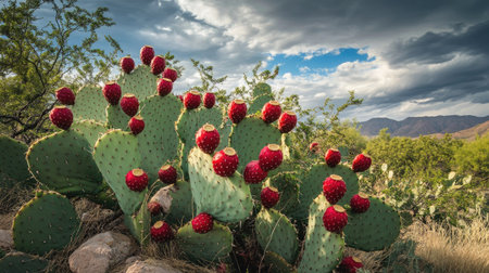 The giant prickly pear cactus with numerous red fruits, captured in the rugged beauty of Saguaro National Park, Arizona, under the harsh desert sunlight.