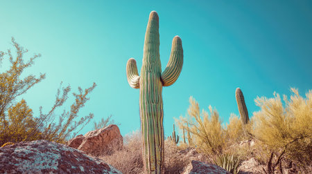 Low-angle shot of a tall saguaro cactus, with its arms raised toward a bright blue sky, surrounded by other desert plants and rocks, emphasizing its height and resilience