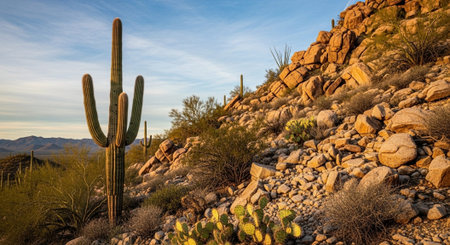 A beautifully vibrant desert scene showcasing a tall Saguaro cactus set against a strikingly blue sky above. Generative AI