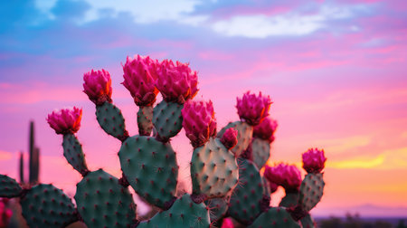 AI Generated. Silhouette of Blooming Cacti on Desert Cliff at Sunset