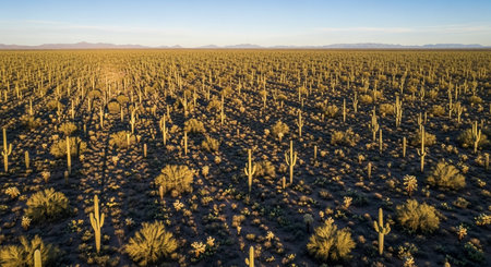 an aerial view showing saguaro cacti and desert shrubs under a clear blue sky during the sunset hours