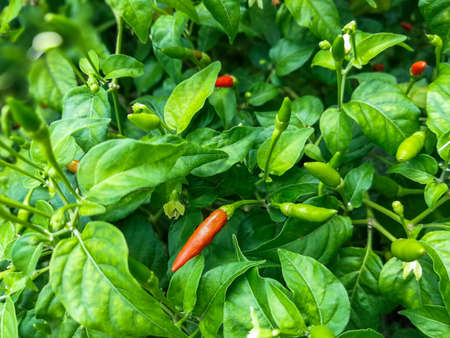 Red and green chili peppers on the tree in garden.