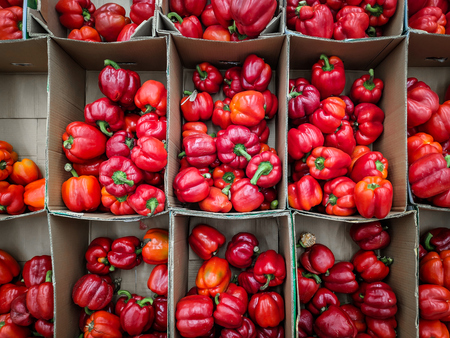 Red peppers in box, background. Fresh peppers variety grown in the shop.
