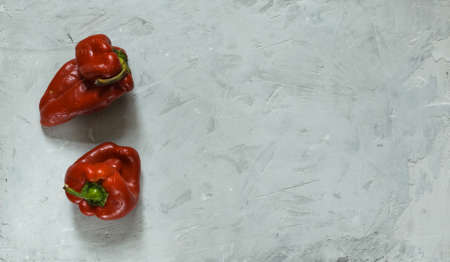 Two ugly fresh red peppers on a gray stone background. Horizontally, with space, top view