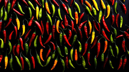 Vibrant red chili on yellow background, lay flat. Red spicy chili peppers wallpaper pattern