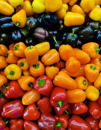Yellow pepper on a market. Landscape. A backdrop of stacked yellow peppers. Street vegetable market.