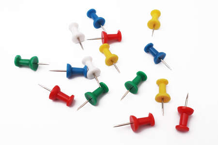 A handful of pushpins in a random position on a white background.