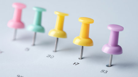 Colored push pins on monthly calendar page. Calendar appointments. Multicolored push pins on calendar. Marked event day, business appointment, meeting with pin. Close-up of push pins on calendar date