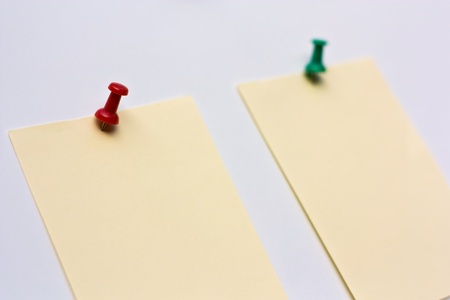 A perspective view of a collection of many blank photo paper pinned to a cork bulletin board with various colored pushpins