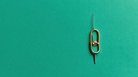 A close-up shot of a golden safety pin and a needle against a vivid green background. This minimalistic composition emphasizes sewing and crafting tools, perfect for creative projects and design inspiration.